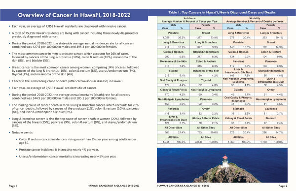 Childhood Cancer in Hawai‘ i------------------------------------------------------------ Figure 7. Age Distribu�on of Childhood Cancers, Hawai‘ i 2018-2022 Figure 8. Cancers in Individuals Ages 19 and Under, Hawai‘ i 2018-2022 Breast Cancer in Hawai‘ i----------------------------------------------------------------- Figure 9. Breast Cancer Incidence and Mortality, Hawai‘ i, 1993-2022 Figure 10. Breast Cancer Cases by Age at Diagnosis, Hawai‘ i, 2018-2022 Figure 11. Breast Cancer Incidence and Mortality, by Race / Ethnicity, Hawai Figure 12. Breast Cancer Stage Distribu�on, Hawai‘ i 2018-2022 Prostate Cancer in Hawai‘ i-------------------------------------------------------------- Figure 13. Prostate Cancer Incidence and Mortality, Hawai‘ i, 1993-2018 Figure 14. Prostate Cancer Cases by Age at Diagnosis, Hawai‘ i 2018-2022 Figure 15. Prostate Cancer Incidence and Mortality, by Race / Ethnicity, Haw Figure 16. Prostate Cancer Stage Distribu�on, Hawai‘ i 2018-2022 Lung & Bronchus Cancer in Hawai‘ i--------------------------------------------------- Figure 17. Lung & Bronchus Cancer Incidence and Mortality, Hawai‘ i 1993- Figure 18. Lung & Bronchus Cancer Cases by Age at Diagnosis, Hawai‘ i 2018 Figure 19. Lung & Bronchus Cancer Incidence and Mortality, by Race / Ethni Figure 20. Lung & Bronchus Cancer Stage Distribu�on, Hawai‘ i 2018-2022 Colon & Rectum Cancer in Hawai‘ i---------------------------------------------------- Figure 21. Colon & Rectum Cancer Incidence and Mortality, Hawai‘ i 1993-2 Figure 22. Colon & Rectum Cancer Cases by Age at Diagnosis, Hawai‘ i 2018 Figure 23. Colon & Rectum Cancer Incidence and Mortality, by Race / Ethnic Figure 24. Colon & Rectum Cancer Stage Distribu�on, Hawai‘ i 2018-2022